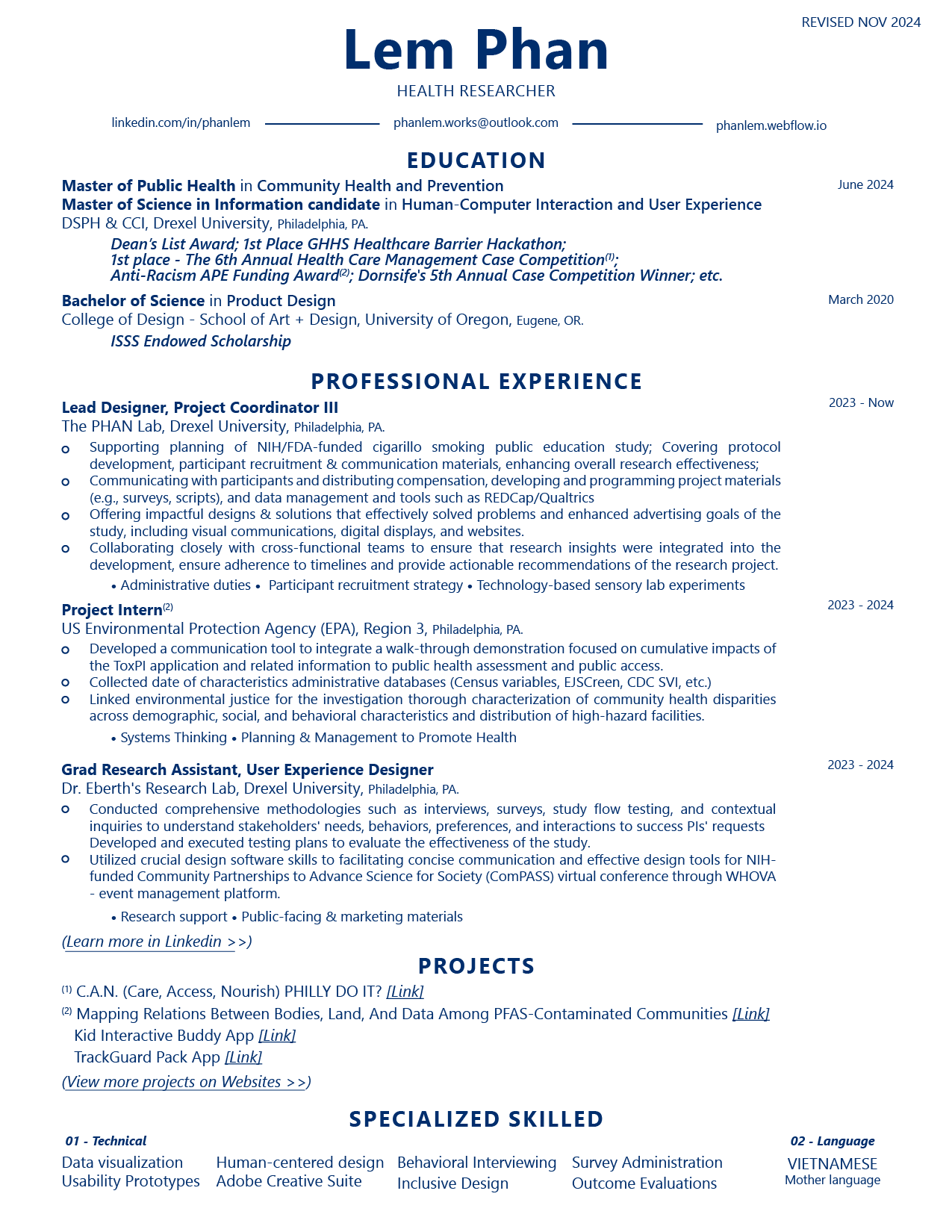 I am a woman, a community health advocate, a designer, and a member of my community. I am inspired and motivated by the certainty: build effective designs for women of color's wellness.My background is an asset for my thinking process. I believe that effective health design is the communication tools built and developed with a keen understanding of the population. A practical approach is to deliver informative messages to the general public and make impacts on the ever-changing world we live in, as well as the responsibility to prosper high-quality solutions that would be in reach to our diverse community. I am extremely enthusiastic about the potential to achieve design equity - to serve the members of the low-income communities, communities of color, women of color, and to advocate for better health designs and better outcomes.